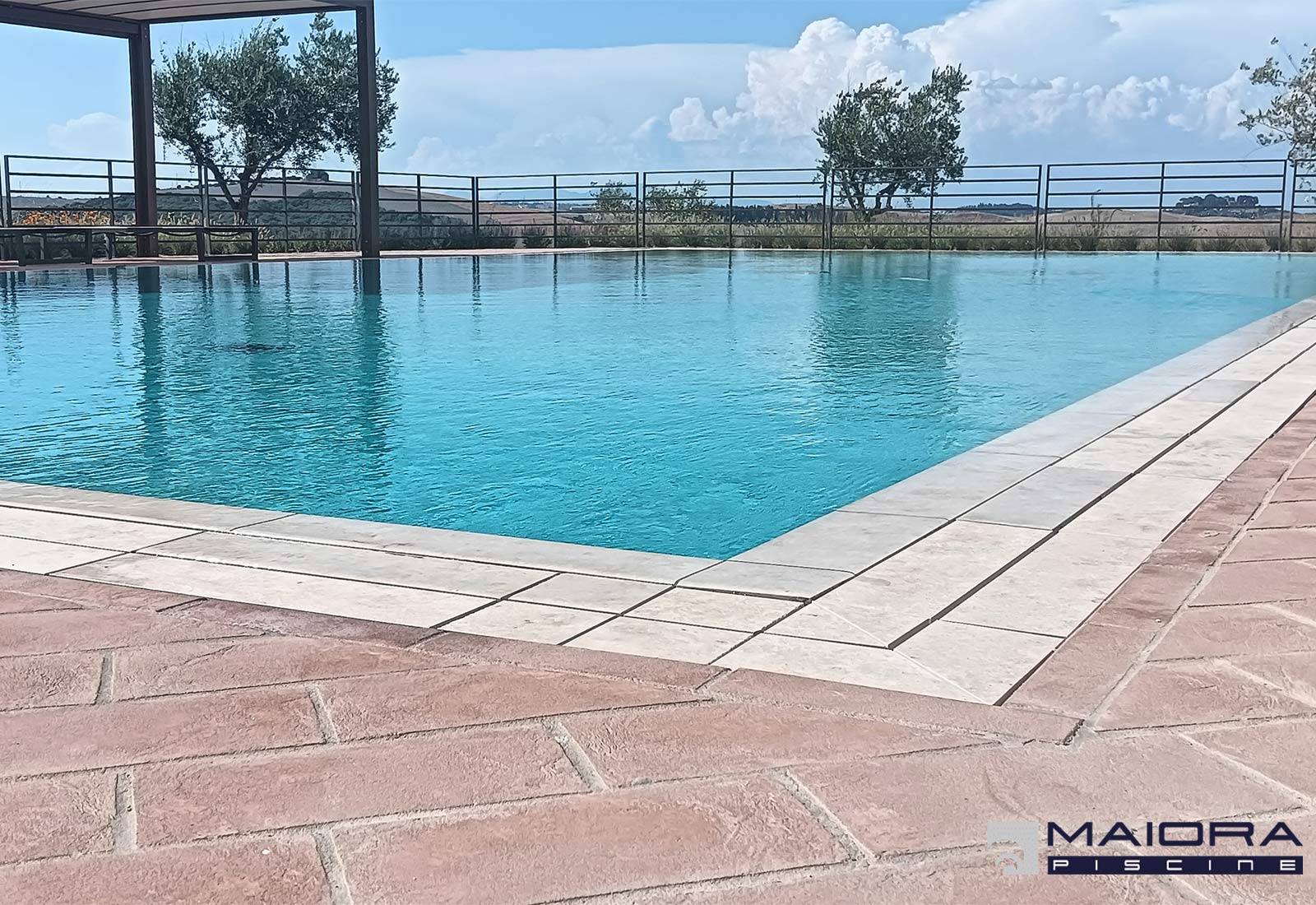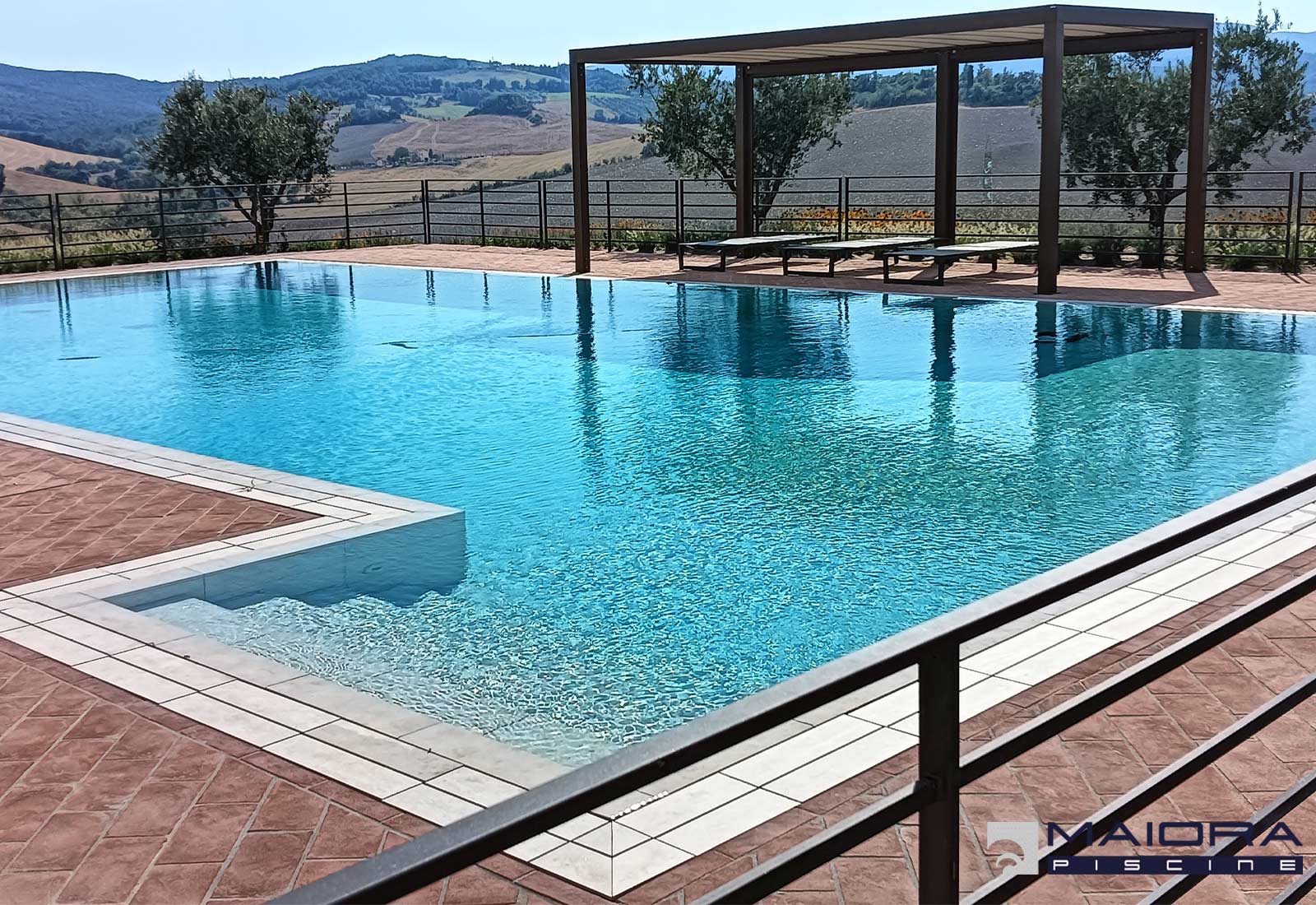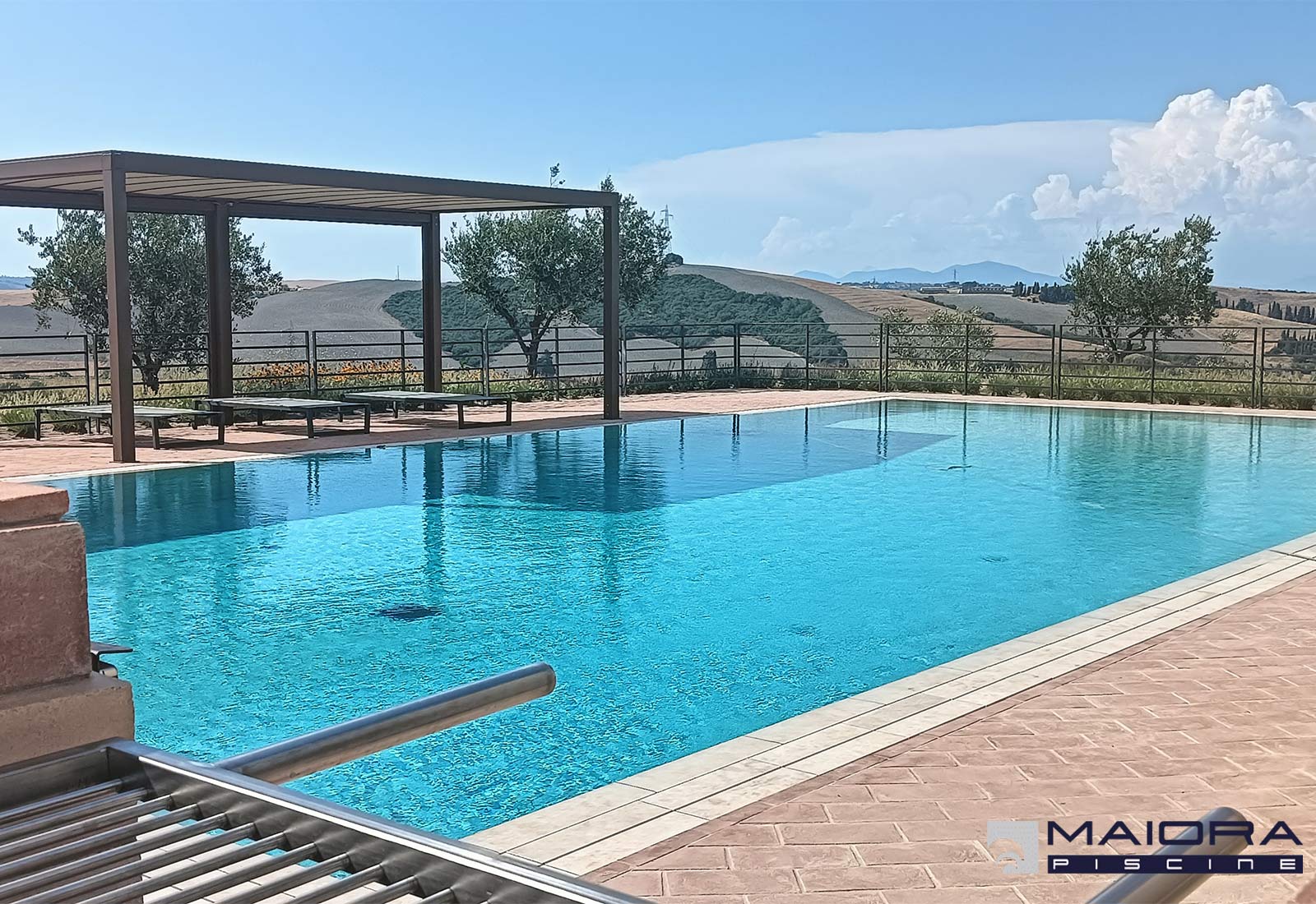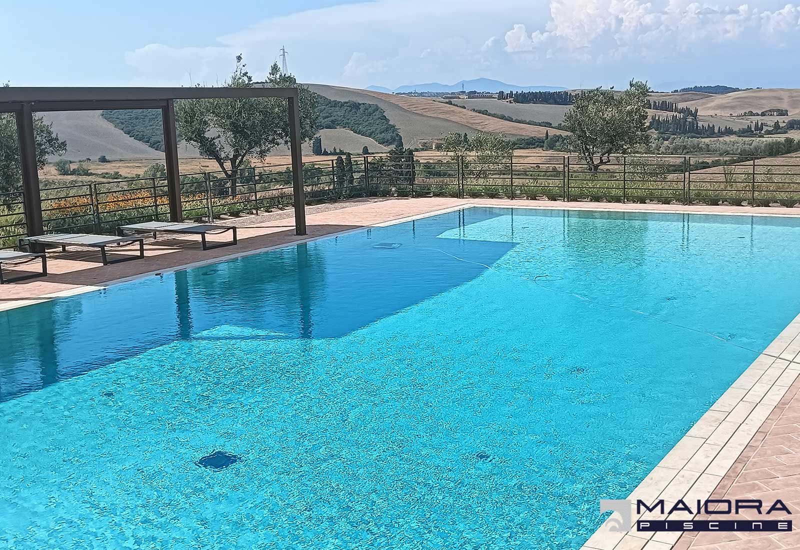 Sulle colline di Lajatico una realizzazione di gran pregio. Dimensioni ragguardevoli per una piscina con sfioro tradizionale su 4 lati. Ampia zona conviviale con profondità di ml 1.20 oltre a scala con spiaggetta per l’ingresso e la zona relax oltre ad una importante zona tuffi di ben ml 2.40. Gli accessori sono in acciaio mentre il rivestimento interno è in piastrelle di gres così come la griglia dello sfioro . Impianto a sale Hayward a basso dosaggio e regolatore di pH. La pavimentazione perimetrale in cotto per dare continuità al gusto rurale della casa, una realizzazione al pari della vista panoramica che si può godere a 360° sulle colline