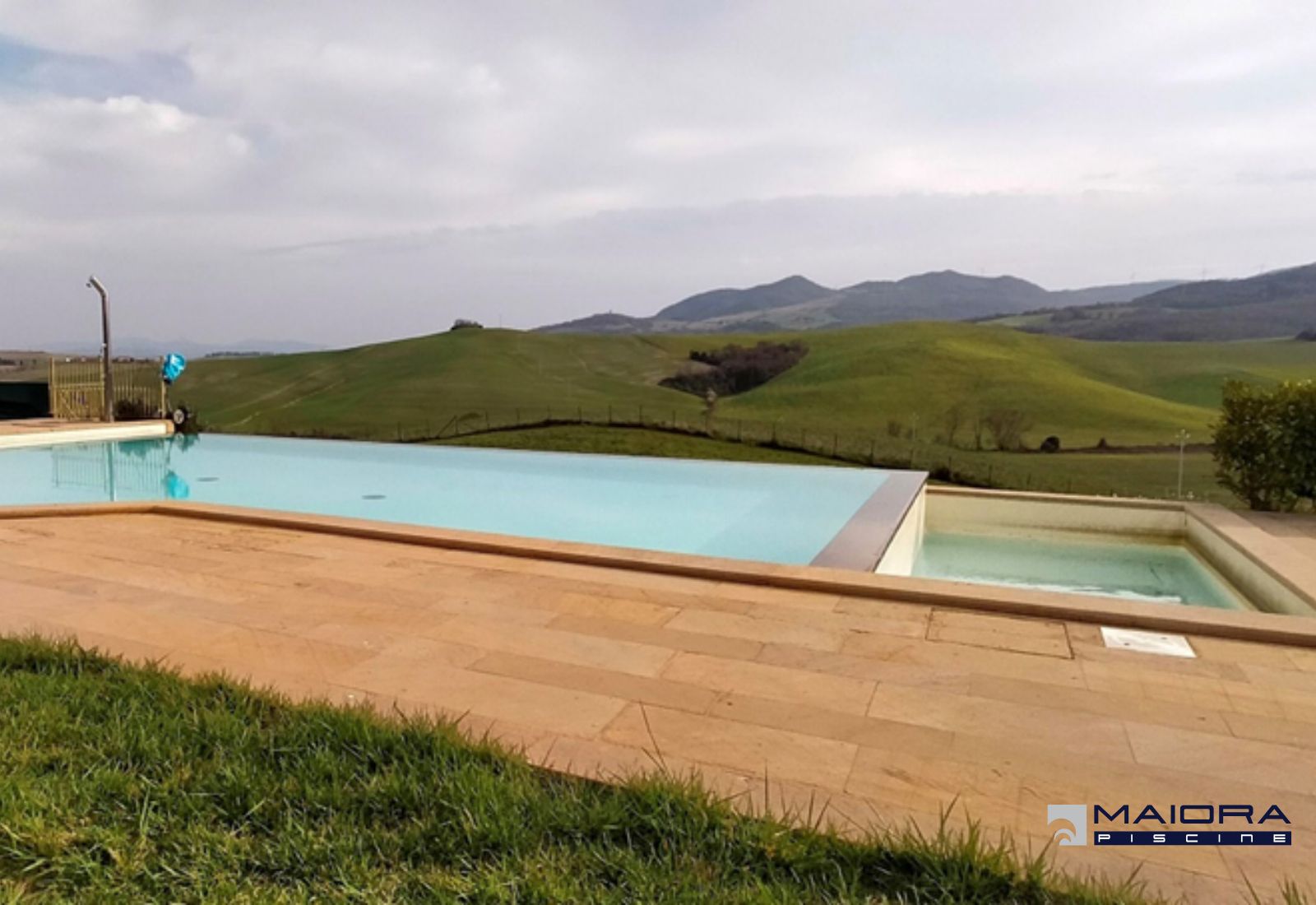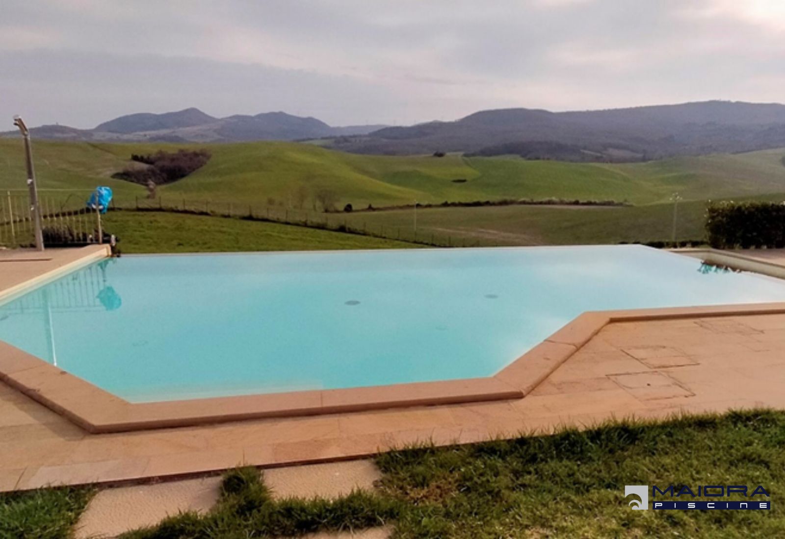 Lo “stramazzo” e’ un sistema di sfioro molto suggestivo. conosciuto anche come “infinity” l’effetto della sua tipologia si esalta maggiormente in presenza di panorami sui quali si affaccia che ne aumentano appunto l’effetto. Queste tre piscine gemelle posizionate sulle colline di Volterra esaltano la bellezza del luogo e della piscina stessa. La forma trapeizodale ed uno sfioro anche laterale per la creazione di una vasca per i piu’ piccoli danno un ulteriore tocco di originalità. Il rivestimento in pvc color sabbia, la pavimentazione in pietre di santa fiora.