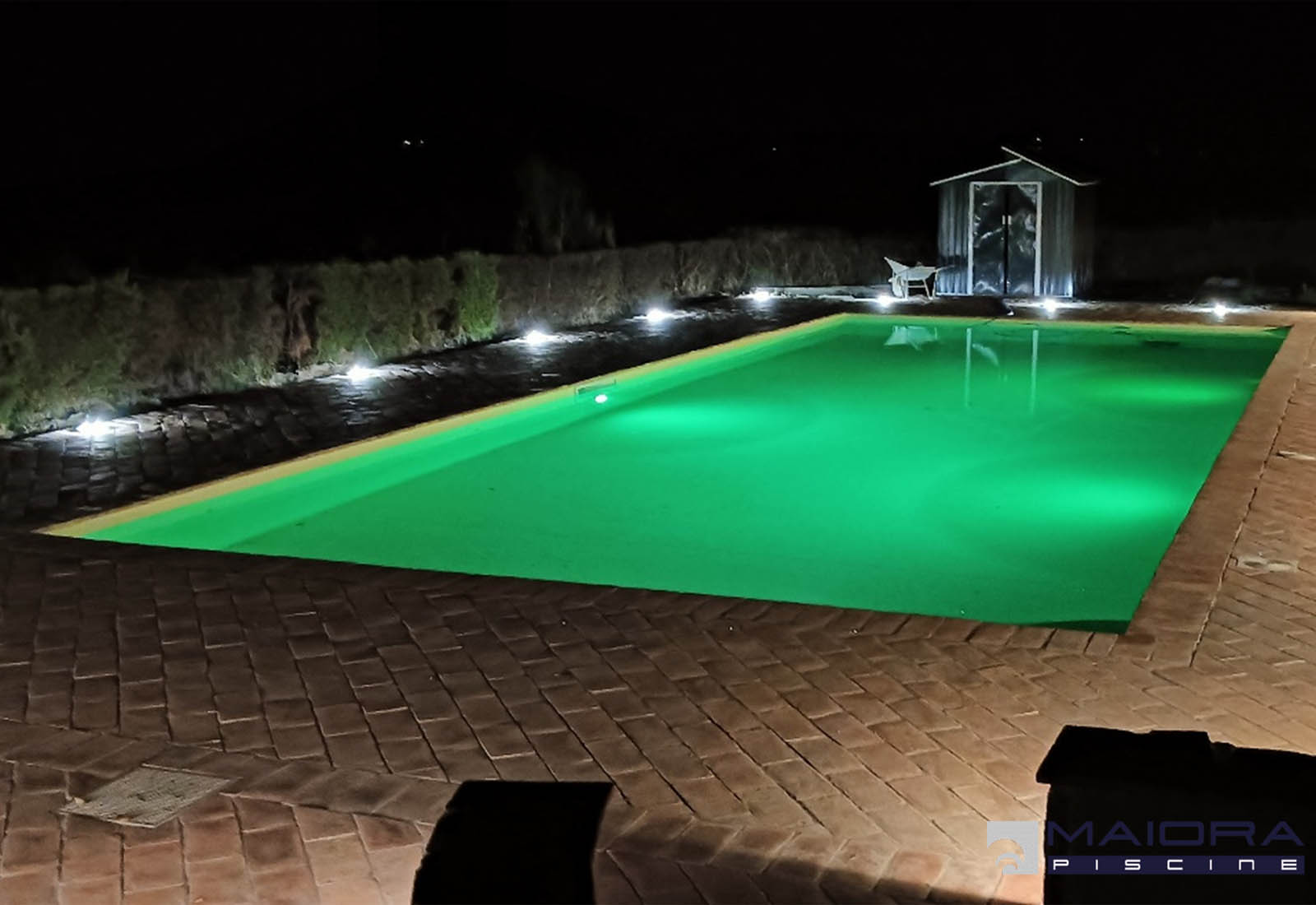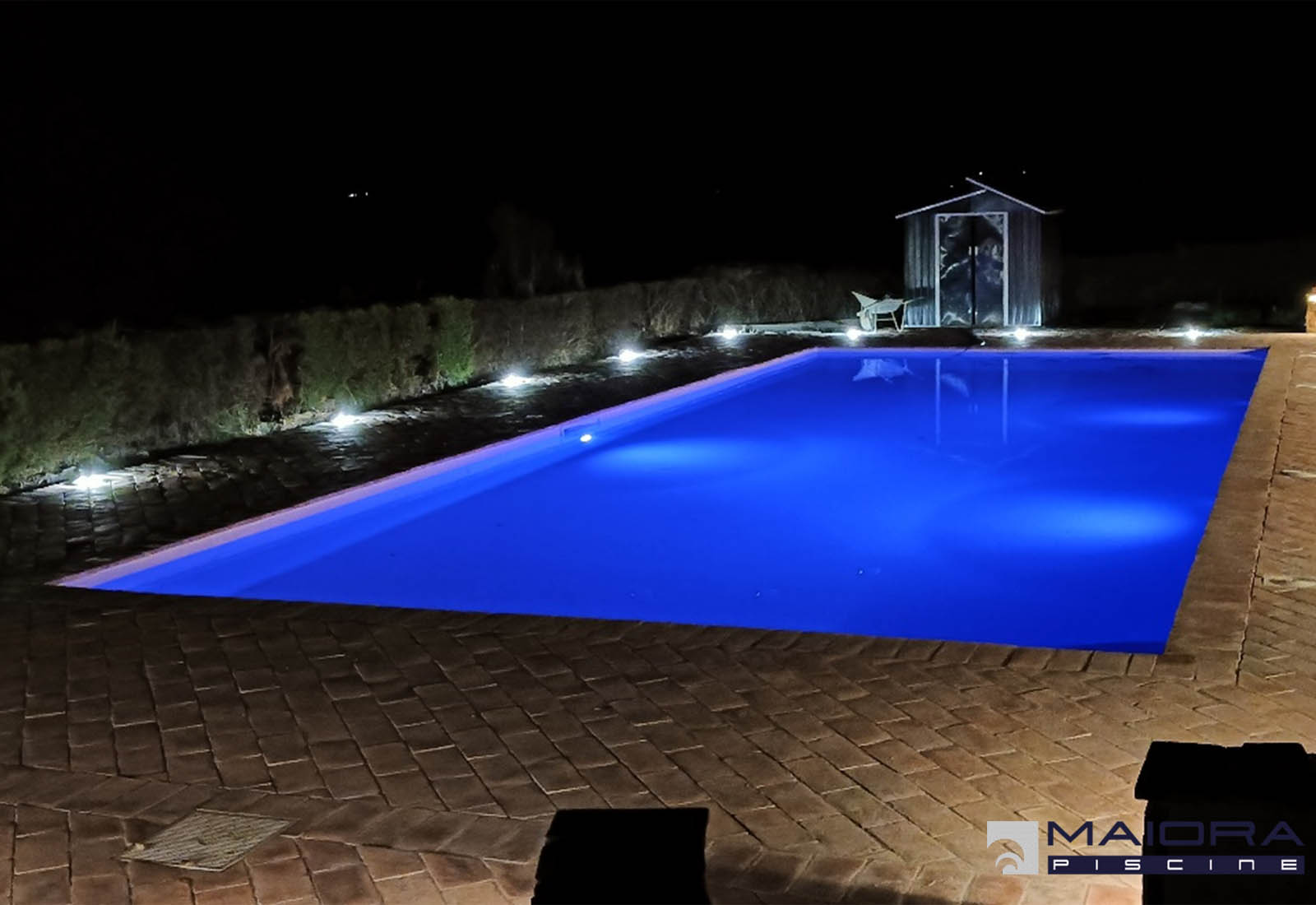 Ristrutturazione completa di una vecchia piscina 6 x 14 con doppia altezza, al servizio di 6 unità. La pavimentazione in cotto toscano ha sostituito il porfido in opera incerta, contornata da un muretto in pietre murate a secco e impreziosita da una striscia led luminosa faretti a pavimento. La piscina è dotata di un impianto a luci RGB che ne aumentano il fascino.