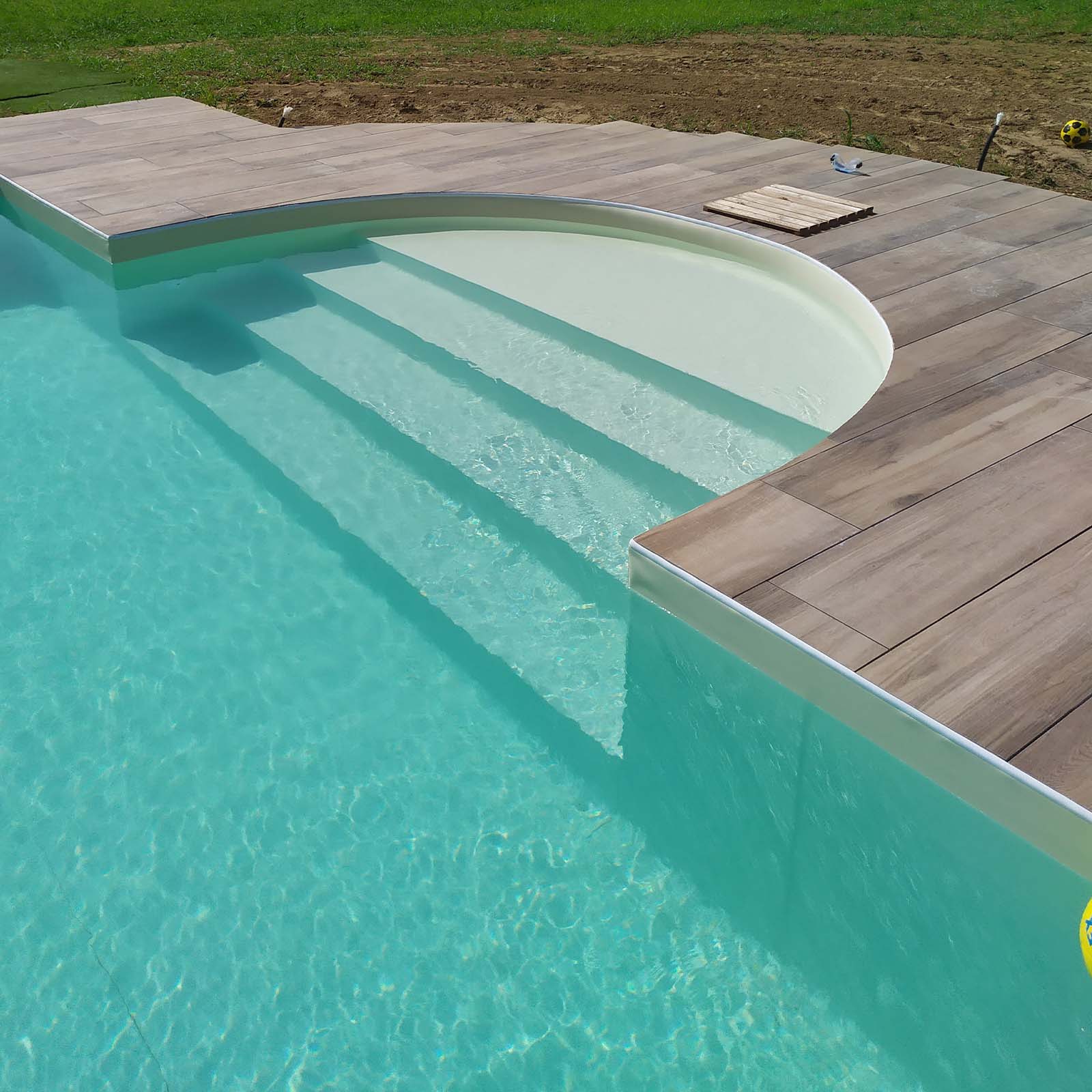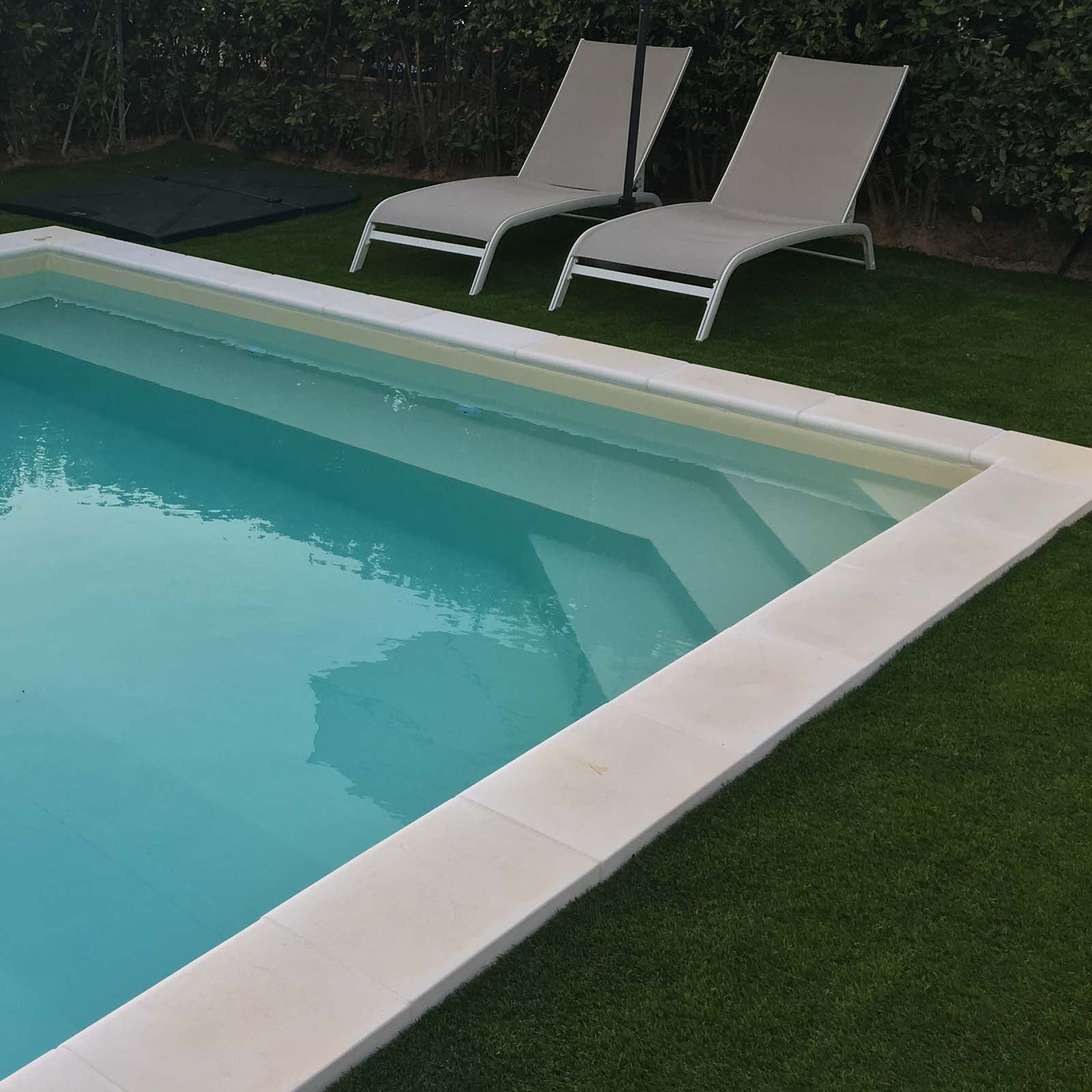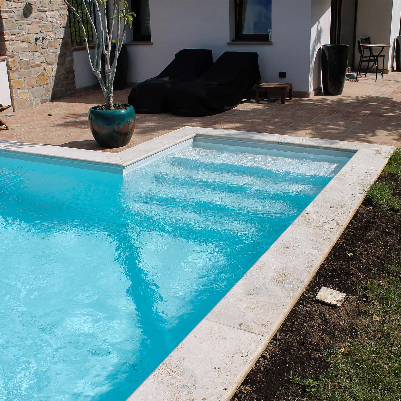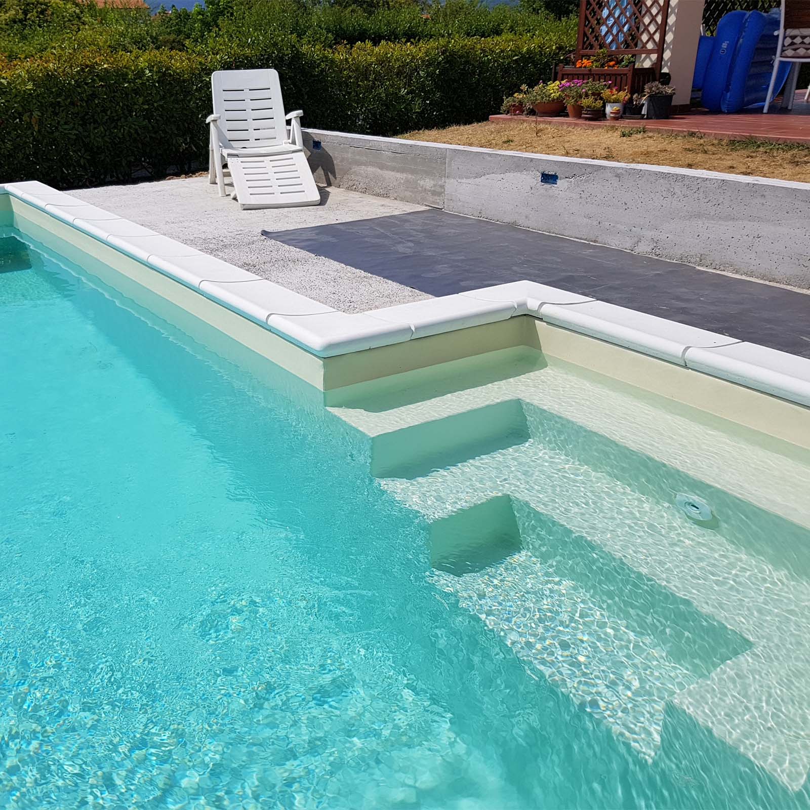 La Scala Recessa o Laterale è un’opzione squadrata che rende la piscina simile ad una “L”.