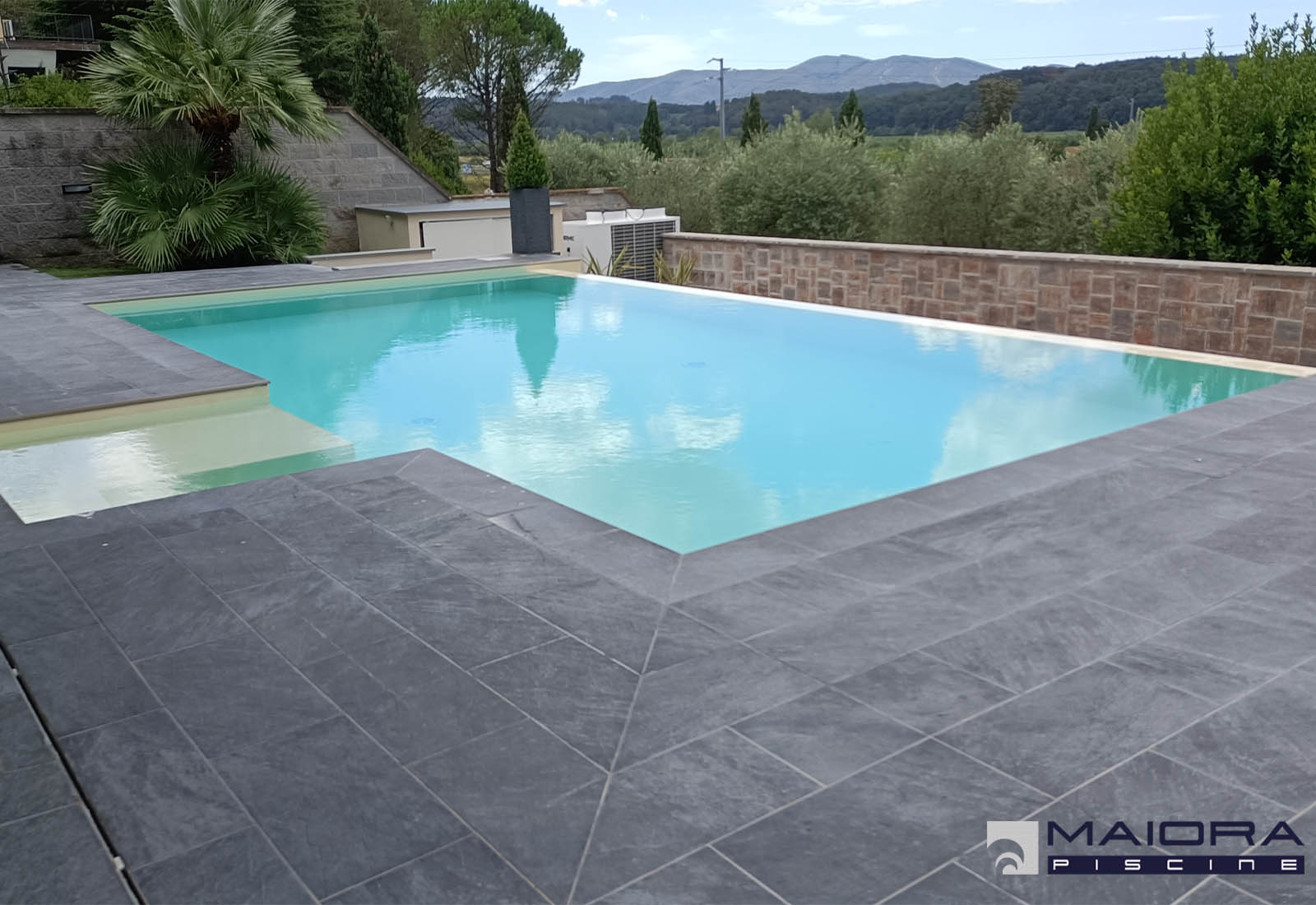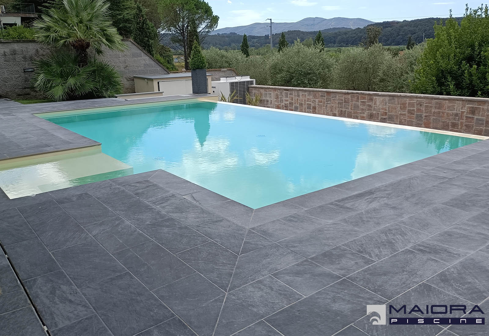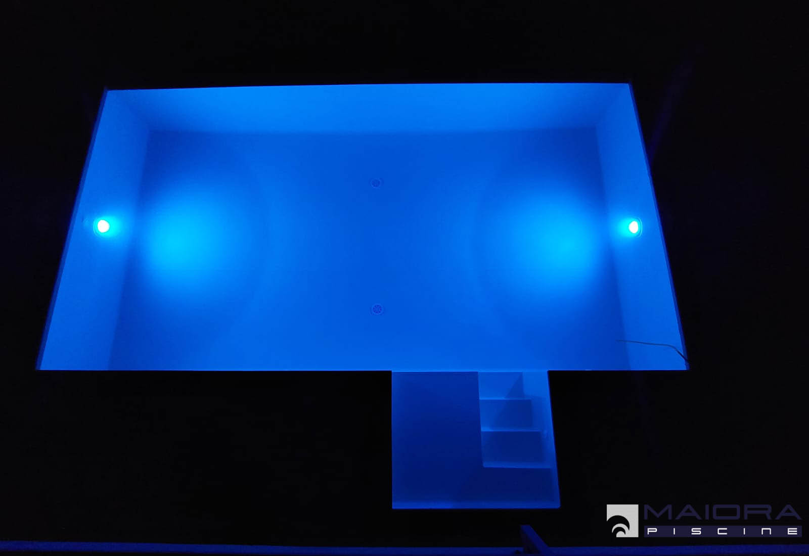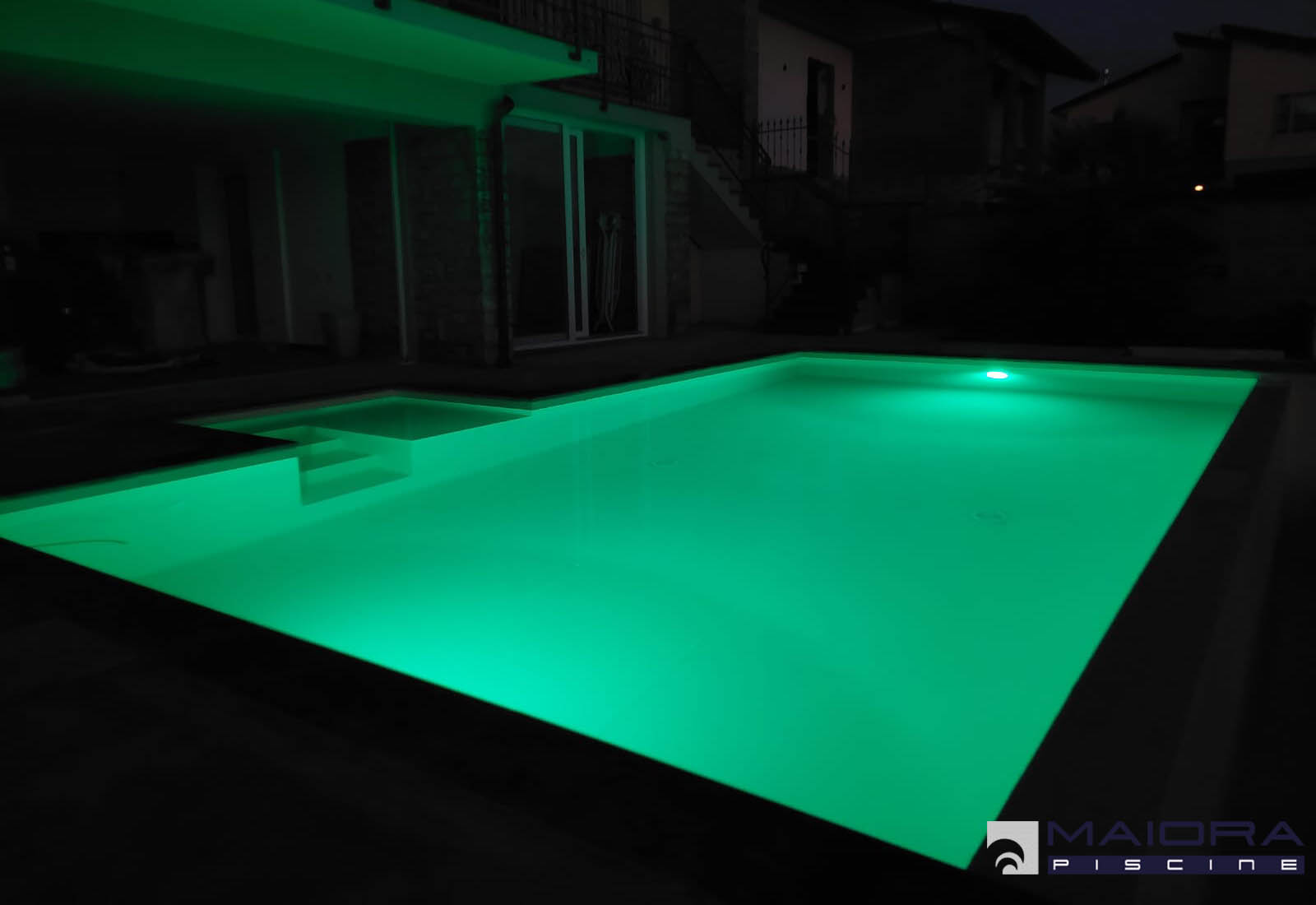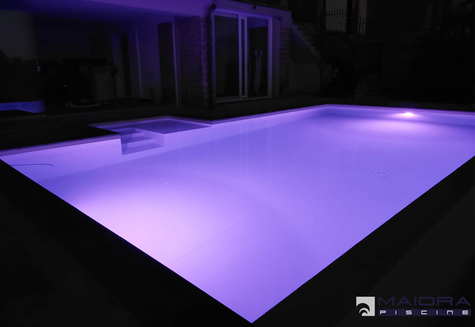 Sebbene nella misura più richiesta (ml 8 x 4m) questa piscina mantiene un alto grado di personalizzazione grazie allo sfioro a stramazzo sul lato lungo e la scala laterale con spiaggetta. L’altezza di 1.40 ml è costante, le luci invece sono RGB e cambiano il loro colore su richiesta oppure con il programma di alternanza.